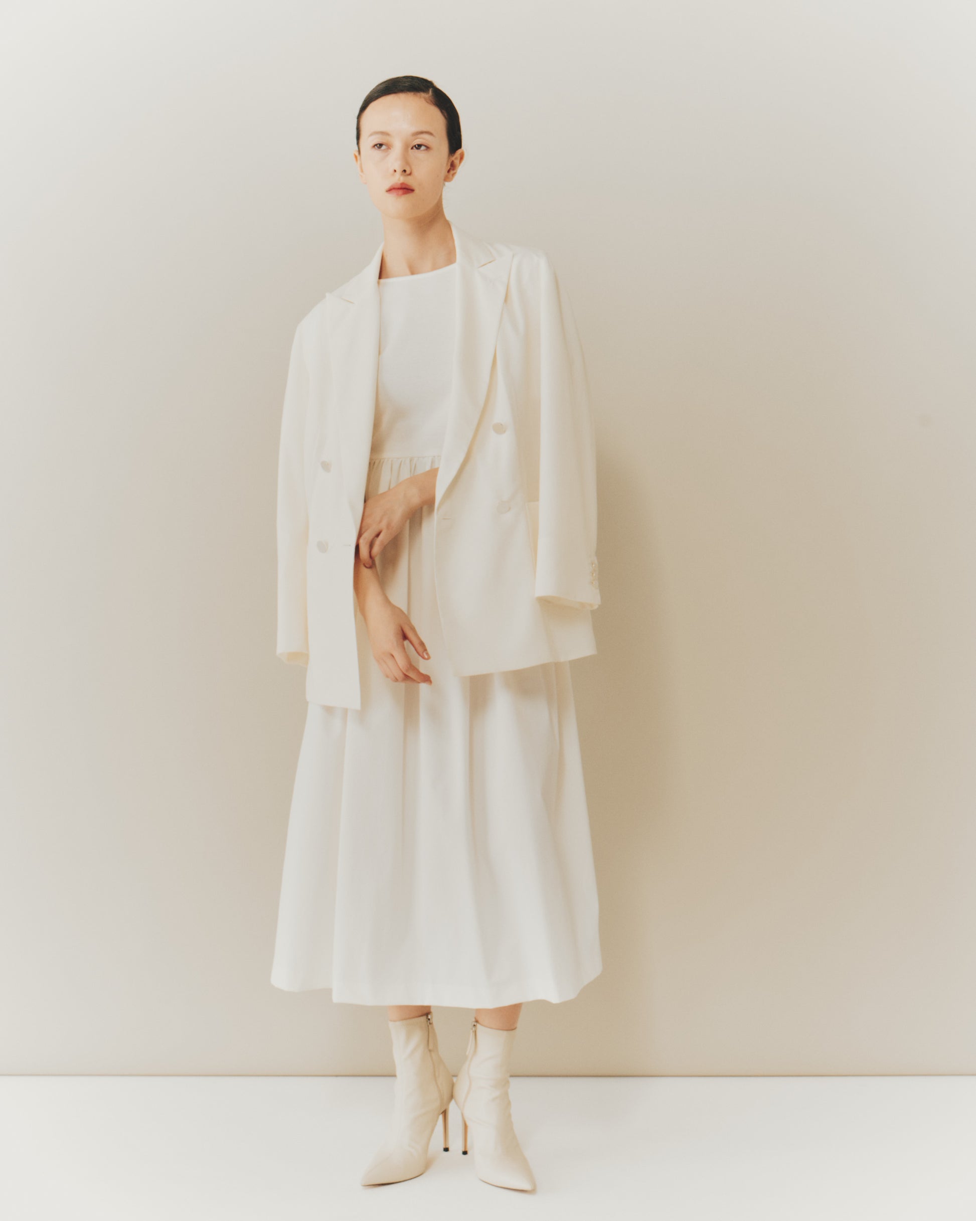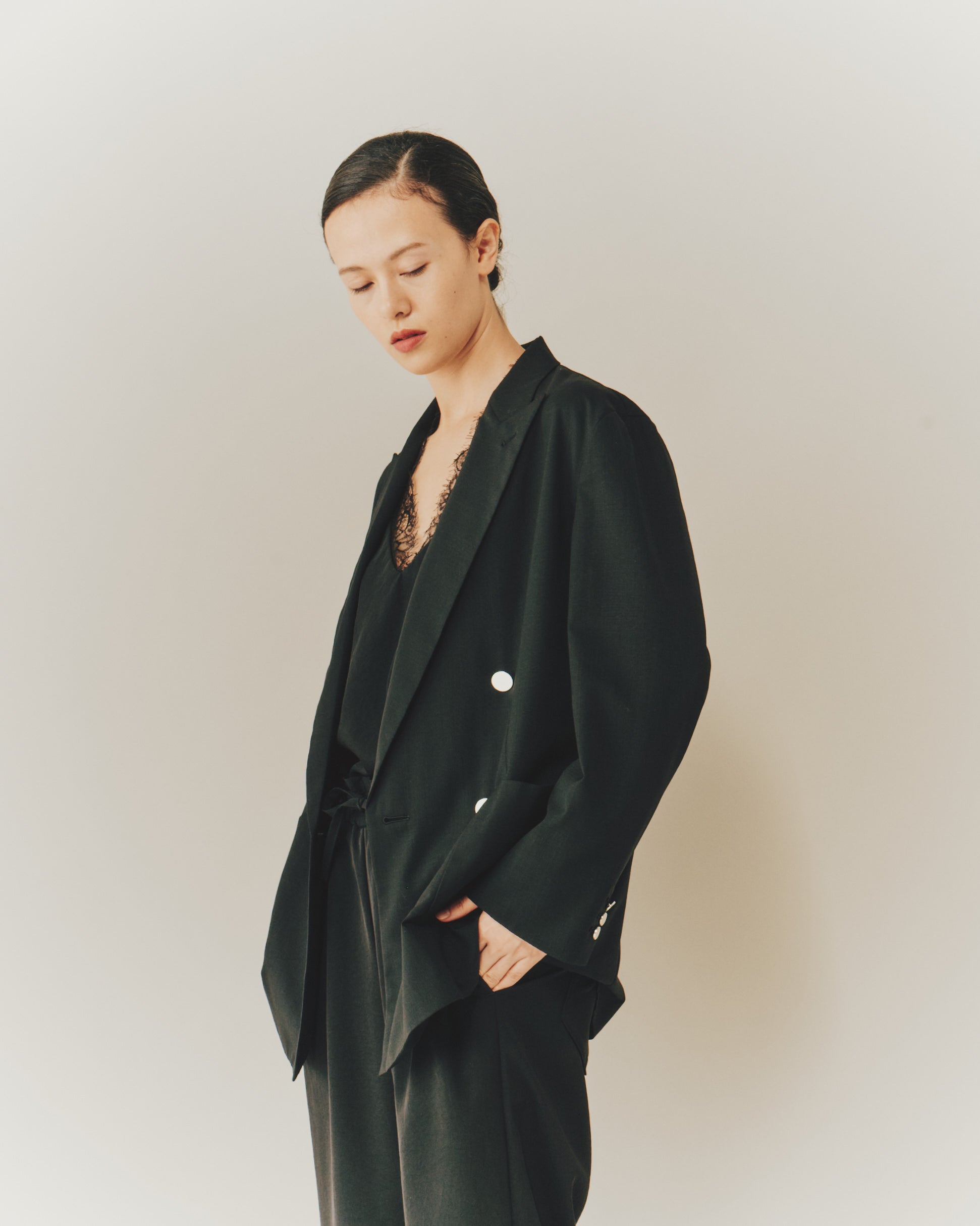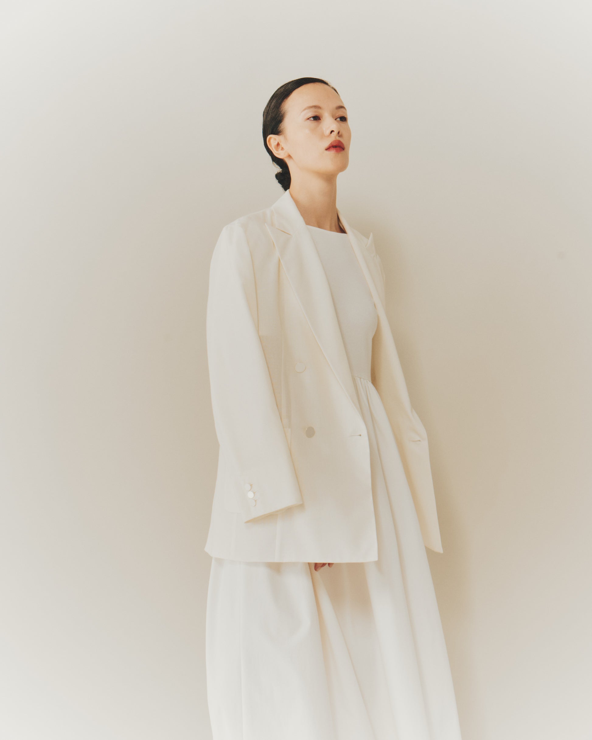 マニッシュなテーラードフォルムに、ほんのりとした透け感を添えて、洗練と柔らかさを共存させた一枚です。表地と裏地が同素材(無双仕立て)で身体に馴染み着心地の良さはピカイチです。ポリエステル混なのでシワになりにくく、形崩れしにくい仕様となっています。