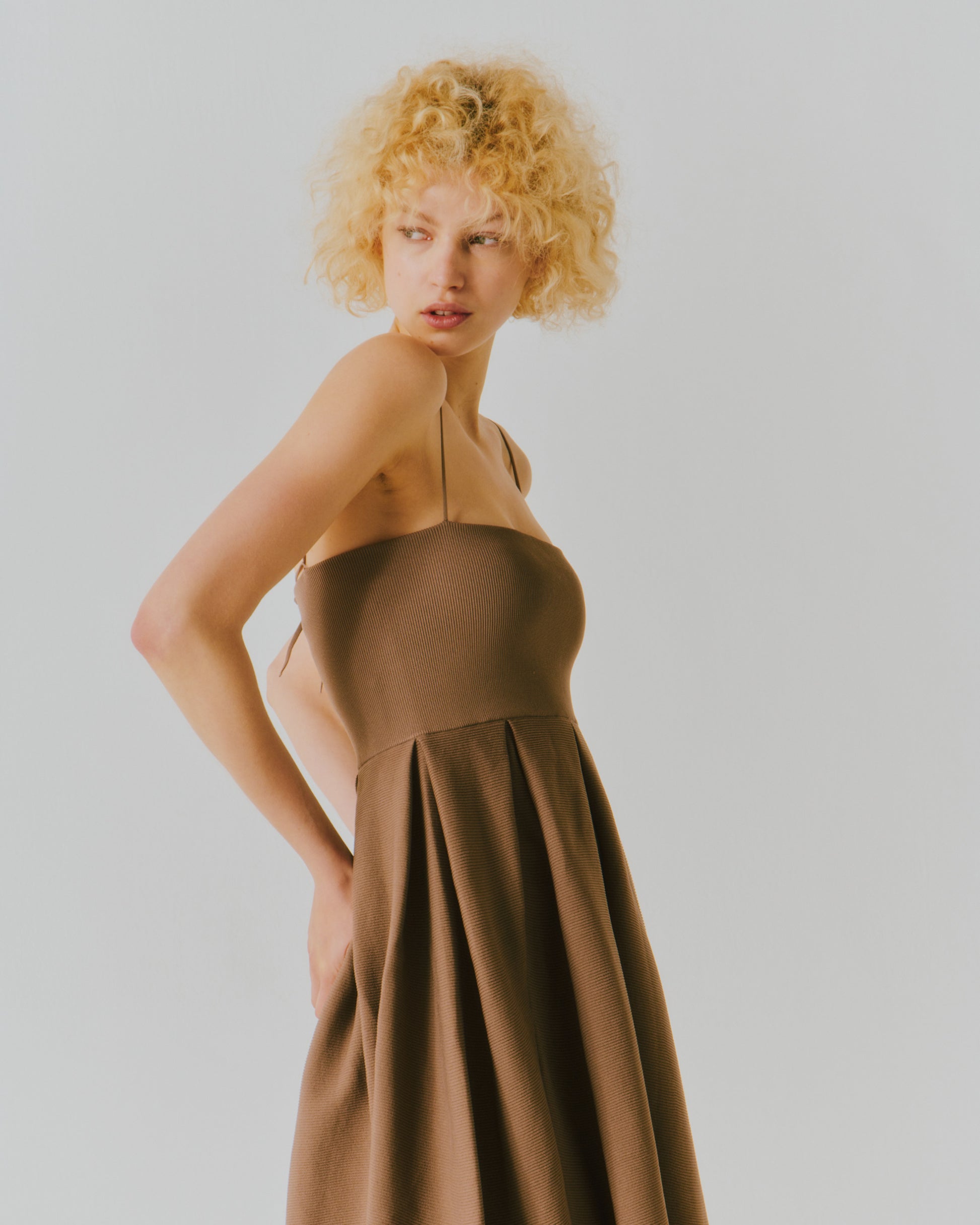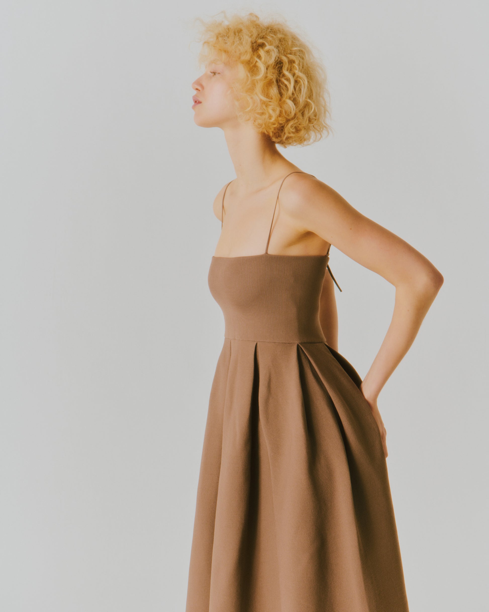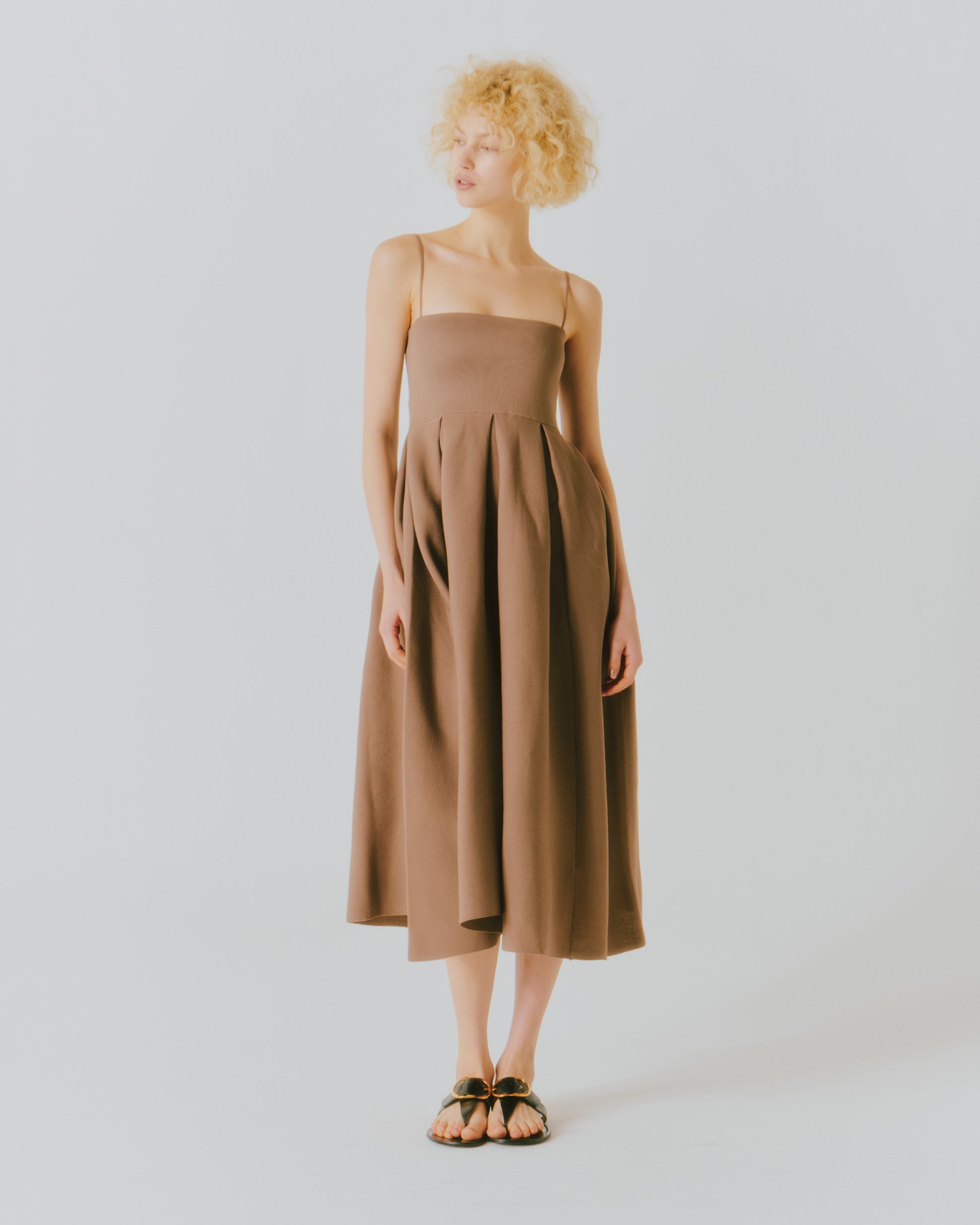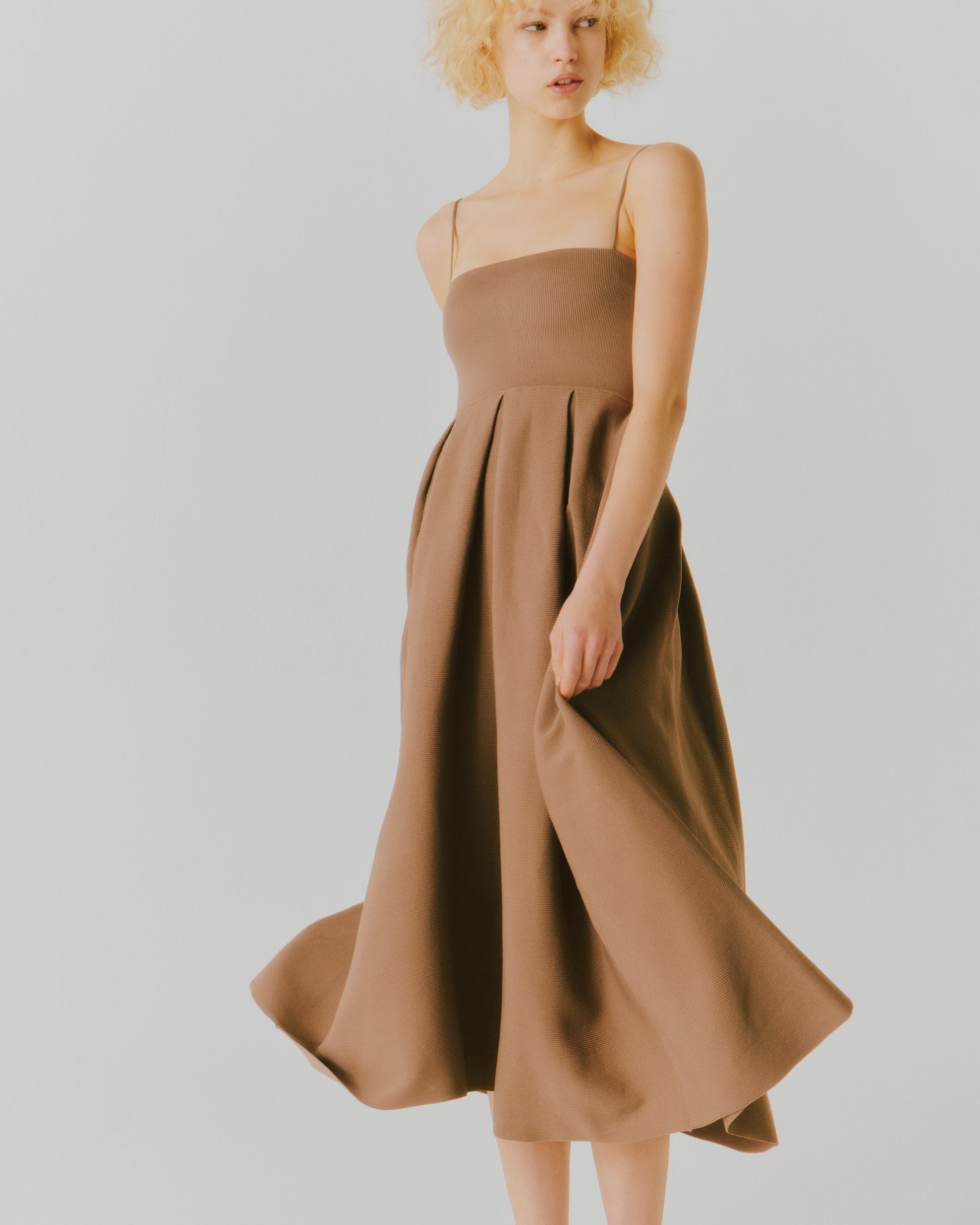 Introducing an updated version of last year's popular bare dress. The skirt has been changed to a lighter knit fabric, and various in-box pleats have been applied to create a flared silhouette. It comes with shoulder straps so you can wear it as a bare dress with peace of mind! It's made of dry-touch polyester and feels great against the skin. It's a 2-way item that can be worn as both a bare dress and a skirt.