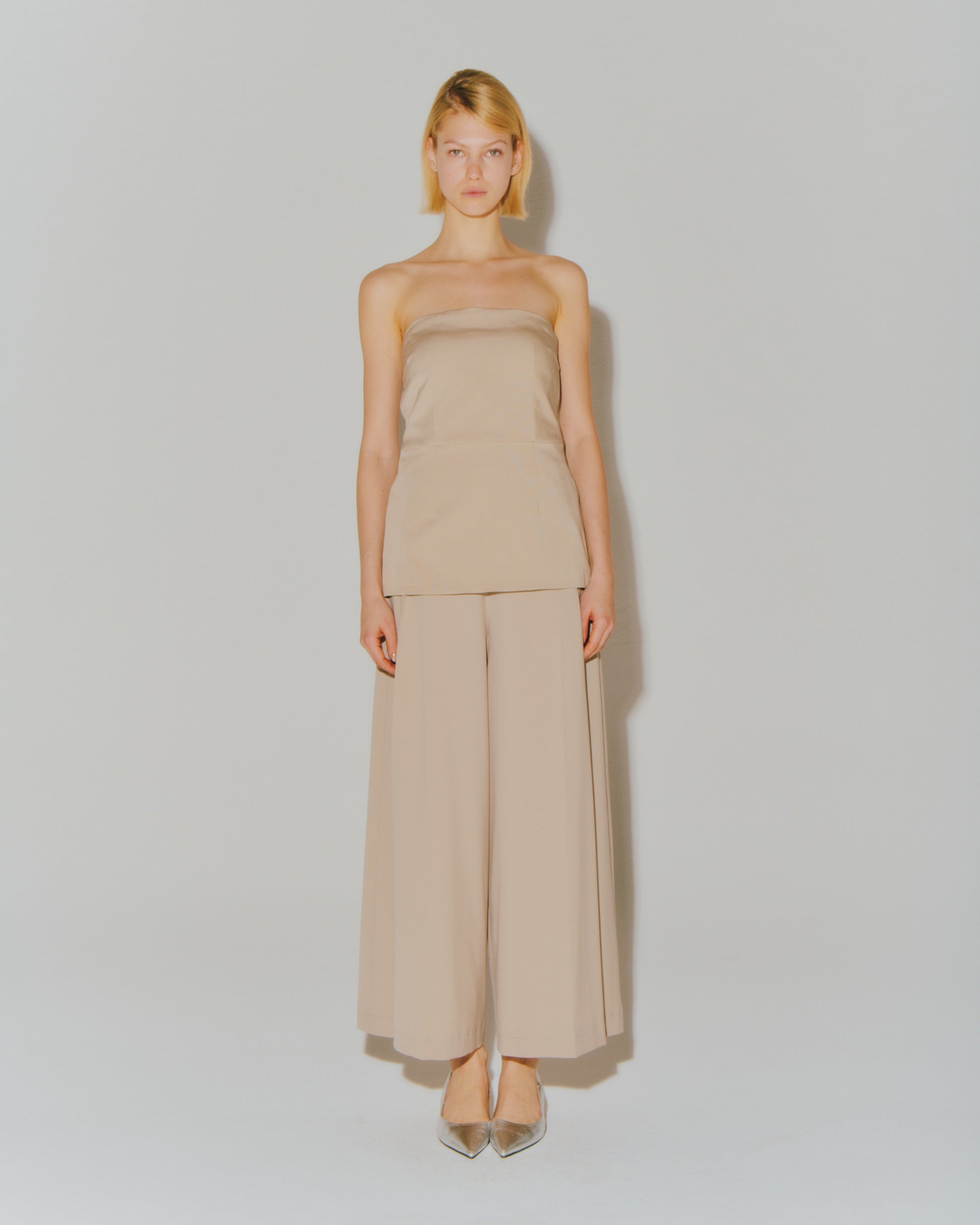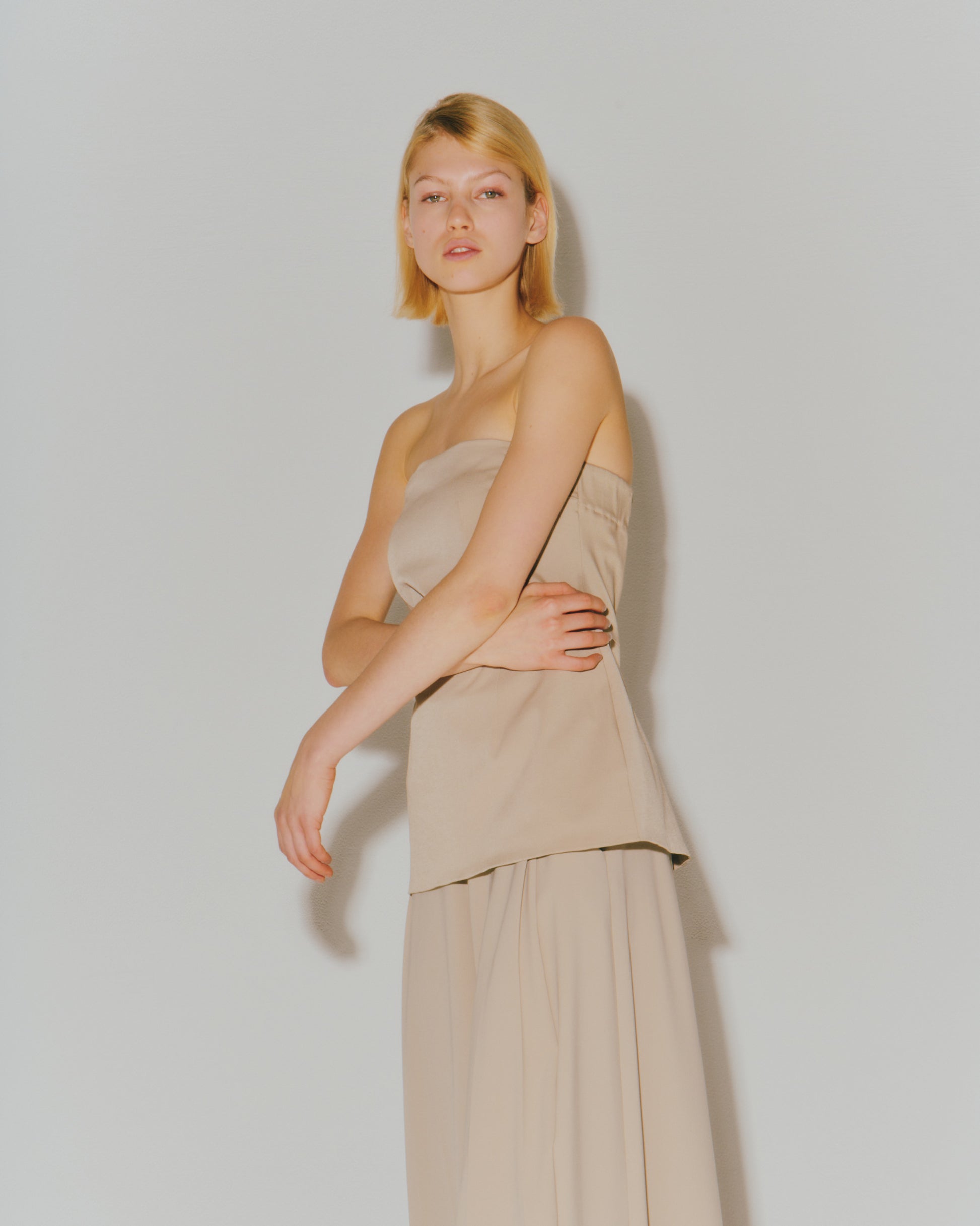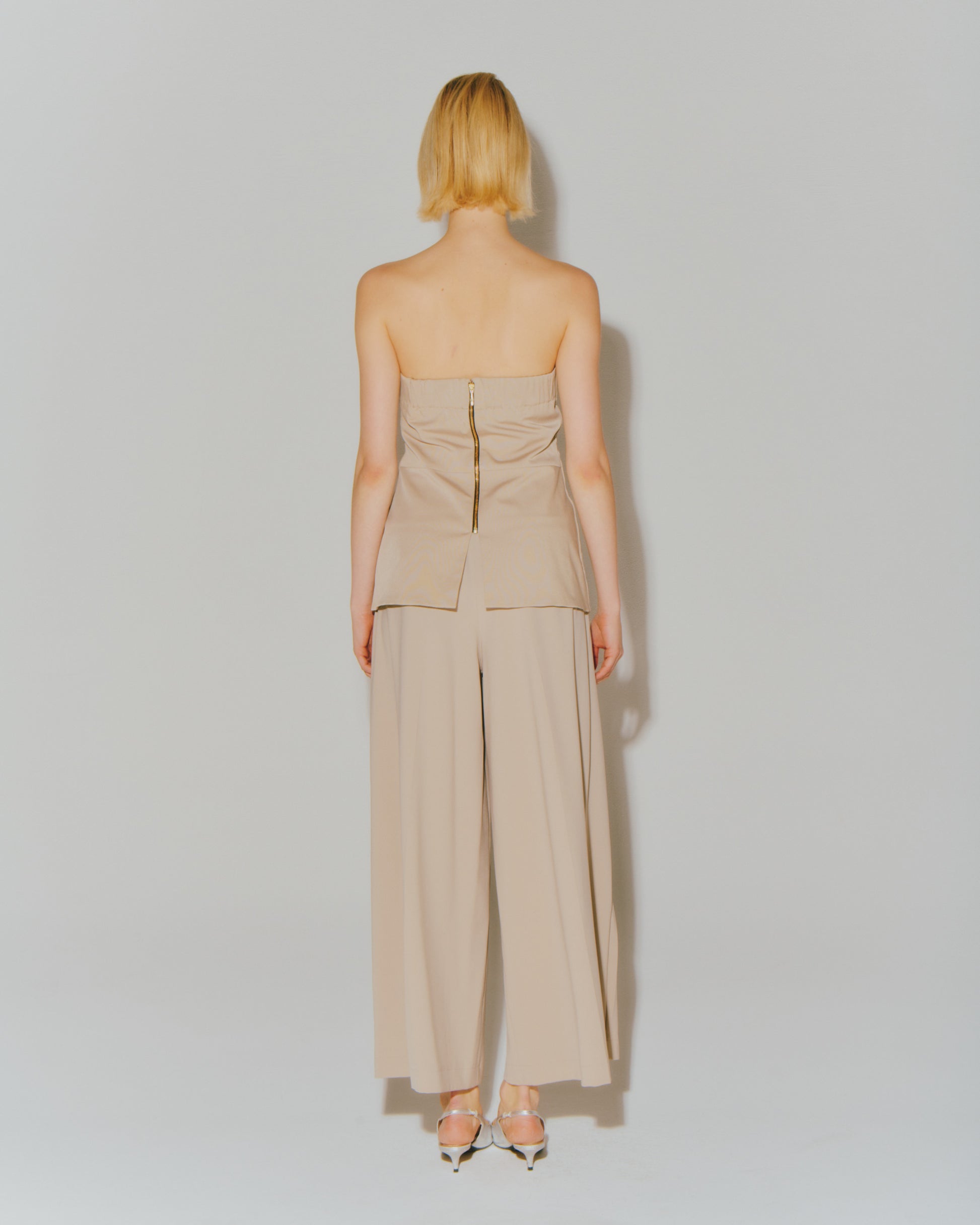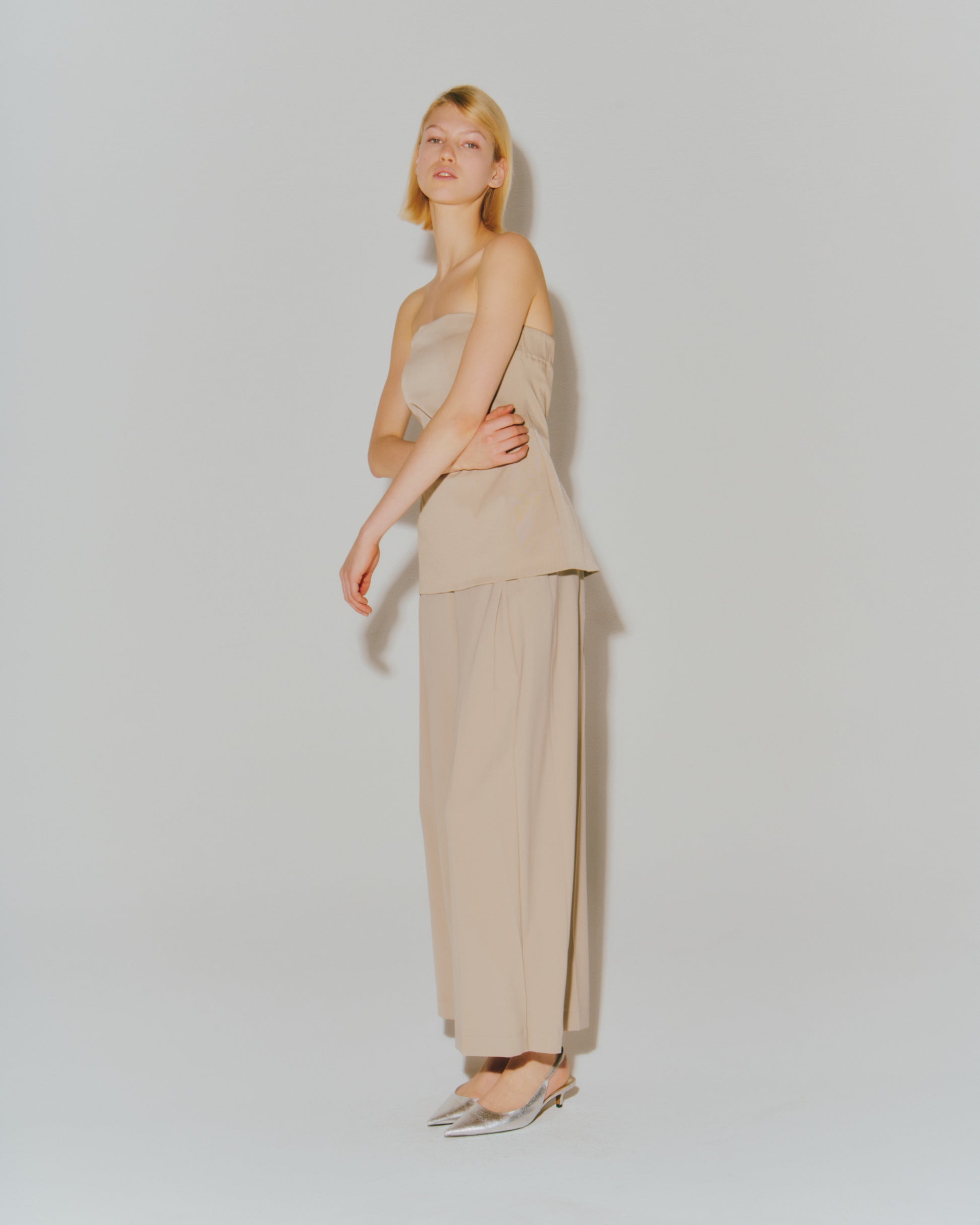 A bare top with a cool, refreshing look. The waistband is cut to create a clean look. It also has removable padding in the bust area. It can be worn on its own as a top or layered with a thin inner layer for a more stylish look. The shoulder straps ensure a secure fit. Pair it with pants made of the same material for a sporty yet elegant look, perfect for this season.