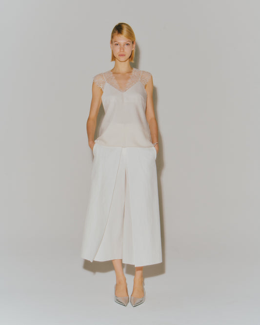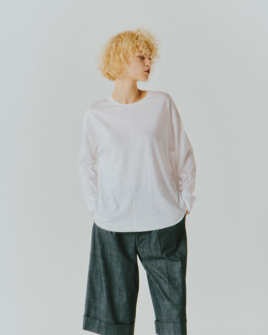 リネンコットン素材を使用したワイドパンツ。風通しを良くする為に脇にシームがなく、足全体をくるむようなデザインになっています。ワイドなシルエットながら足さばきも楽で小柄な方もバランスのとりやすいシルエットです。後ろウエスト部分はゴム仕様でリラックス感あるアイテムです。