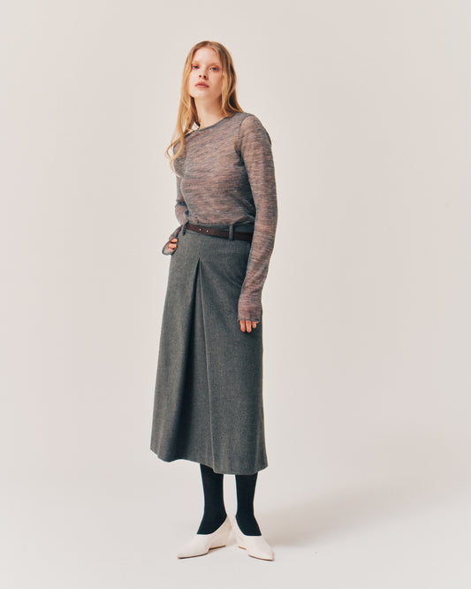 センタープレスを効かせたきちんと感のあるセミストレートパンツ。 女性らしいシルエットを際立たせる為、シンプリズムなデザインとしてフロント部分にコンシールファスナーをつけ、お腹周りのスッキリ魅せを実現させています。 また後ろウエスト部分はベルトのような見え方をする黒の平ゴムをデザインとしており、見栄えはもちろんのこと、ストレスなしの着心地です。サラサラとした風合いが特徴で柔らかく光沢感もあるトリアセテートを採用。ナチュラルなシワ感も風合いのひとつです。 デザイントップスやロングジレはもちろん、ドレスともレイヤード出来る気負わずスマートに完成する美シルエットの一枚です!