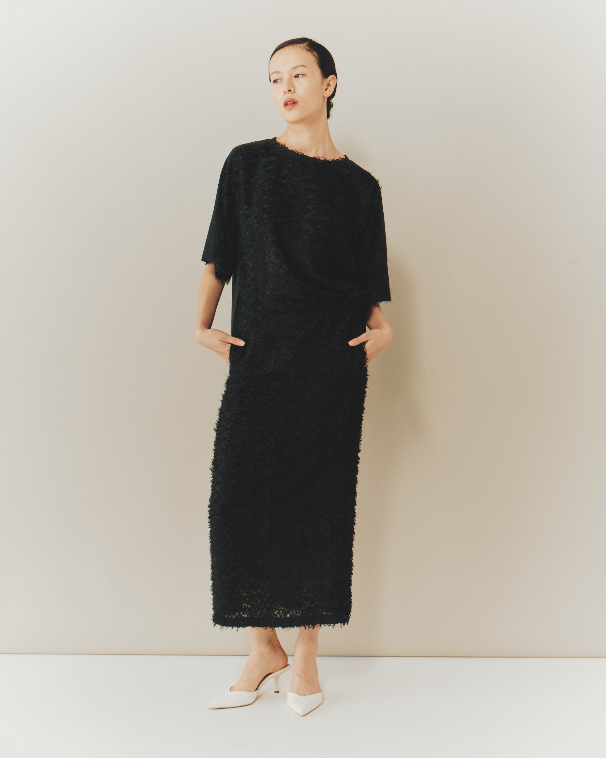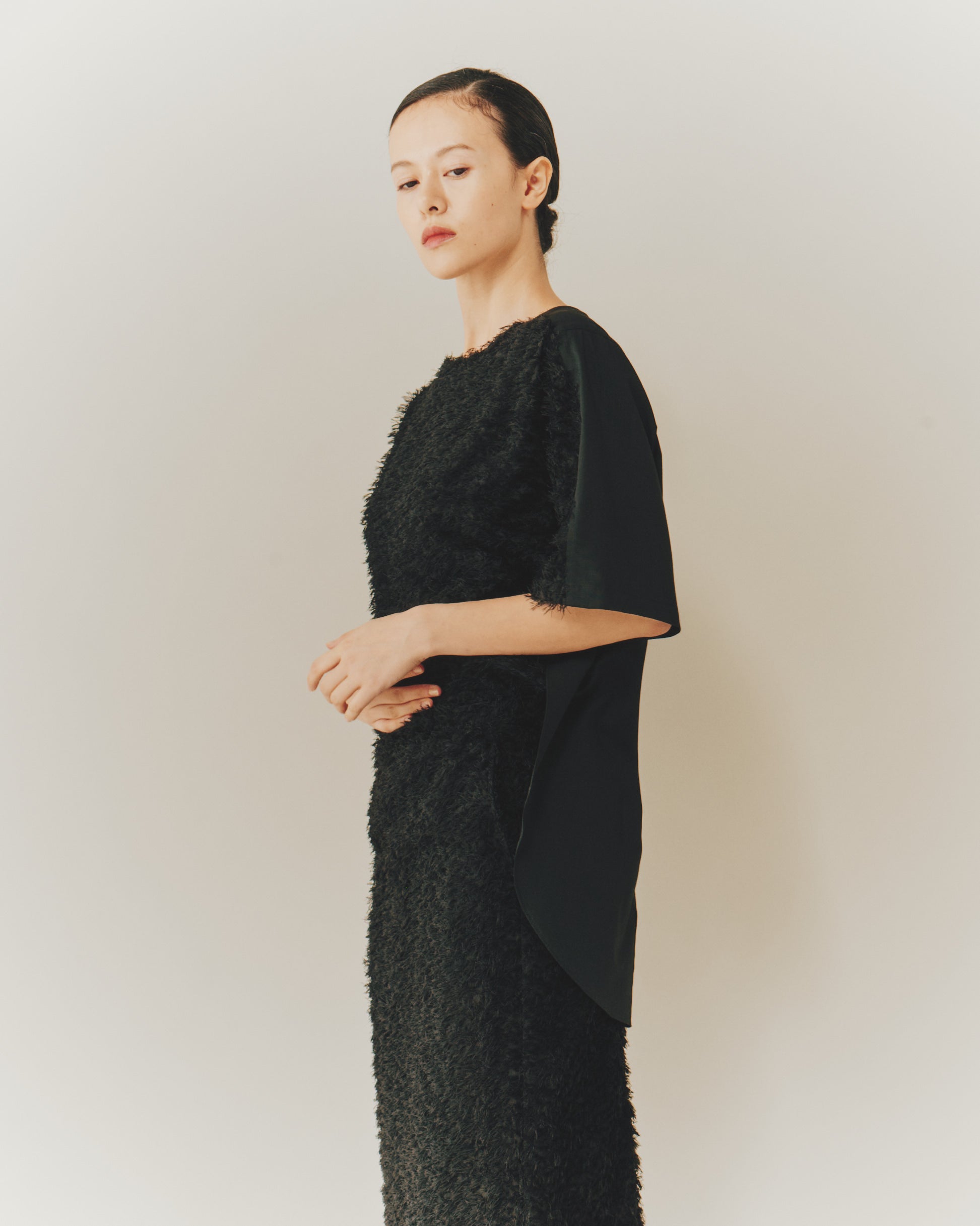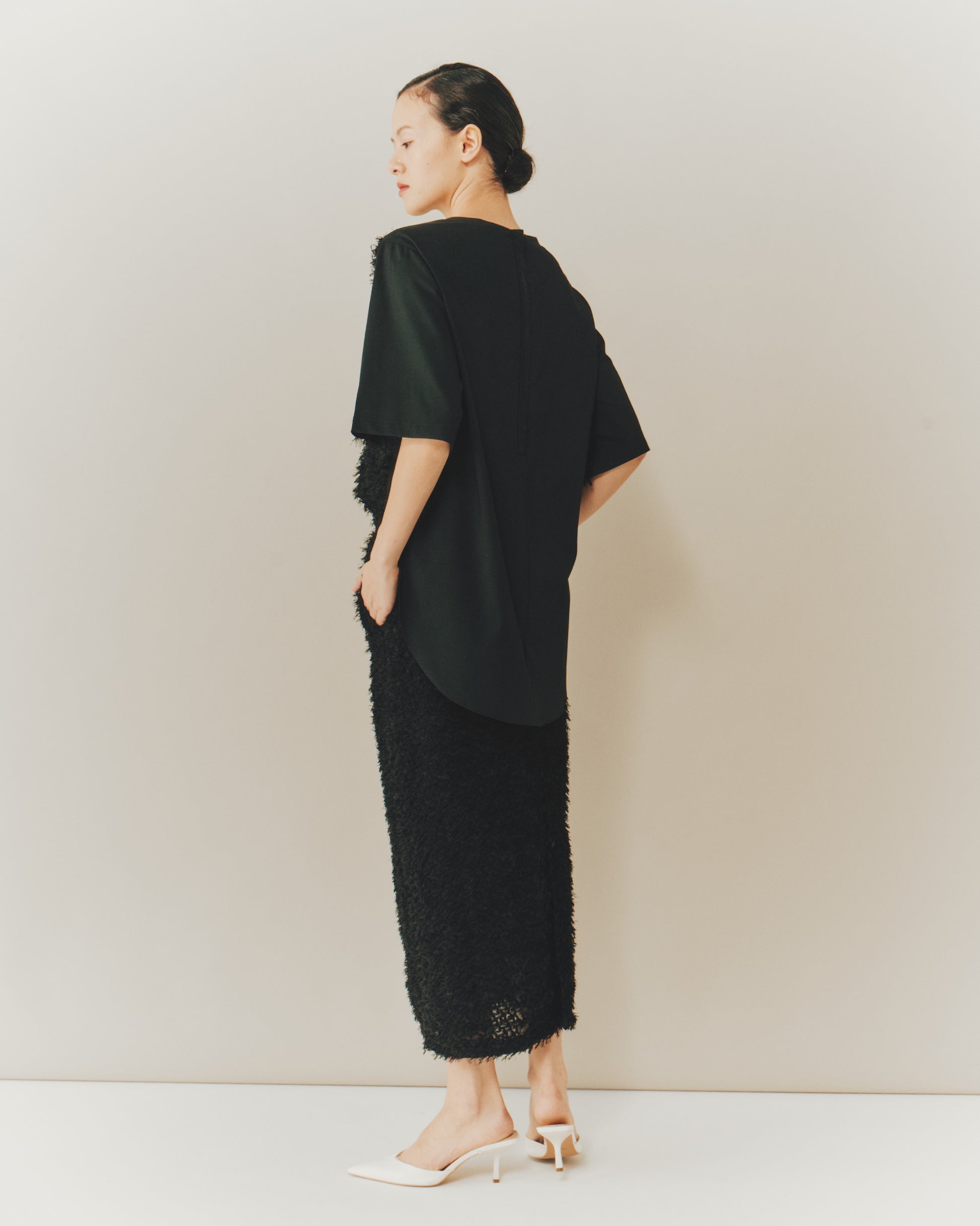 ほどよい透け感と凹凸のあるタッチが、肌に映えるモードな存在感を演出。前後の素材を変えており、デザイン性を感じます。脇のスリットは立体的な線を使用しており、裾をインして着て多様な表情があります。