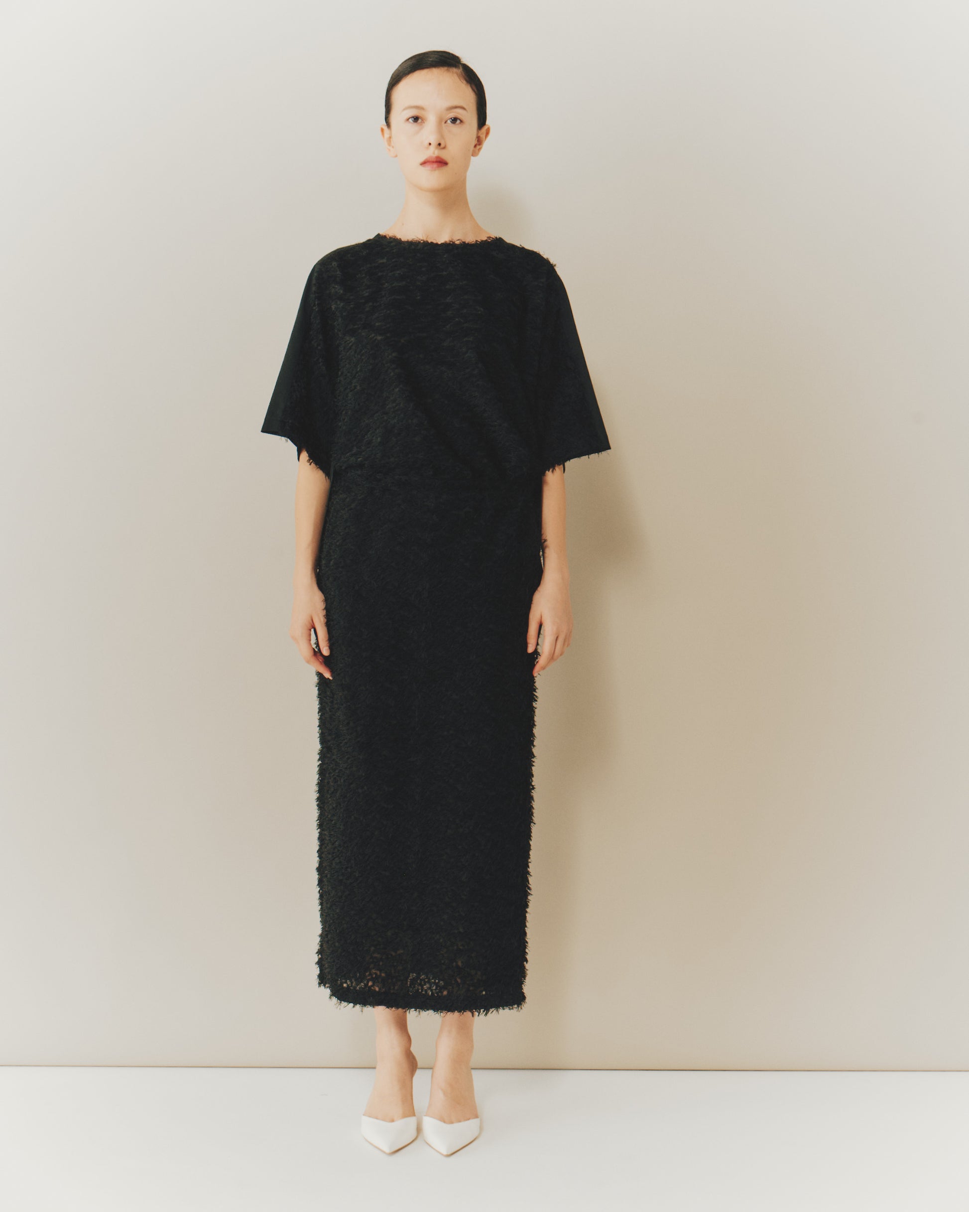 身体のラインを美しくなぞるタイトシルエットが、素材の奥行きと調和してドラマティックに映える。